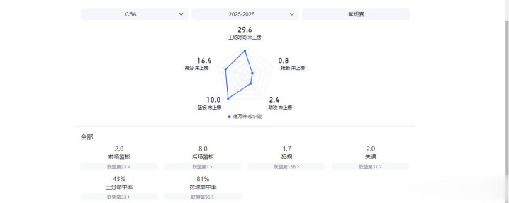 另外,他也是一名出色的全能空间型四号位,第一阶段场均可得到16.4分10篮板2.4助攻1.4盖帽,三分命中率高达43%。